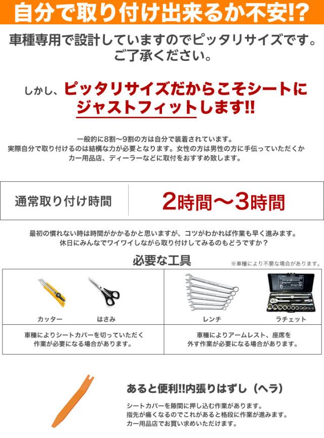 助手席バックテーブル使用可 運転席背もたれのアームレスト部穴あけ加工済み(アームレストの取り外し要) メーカーオプションサイドエアバッグ装備車対応 シートヒーター装備車対応(ヒーター機能はカバー非装着時に比べ弱くなります) |